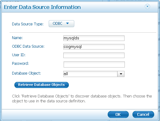 Click on Data Sources -> Click Add… -> Select Data Source type ODBC -> Give any name -> Put the created ODBC name in ODBC Data Source -> Click Retrieve Database Objects -> If your connection is correct then value will come in Database Object dropdown list -> Select all and Ok.